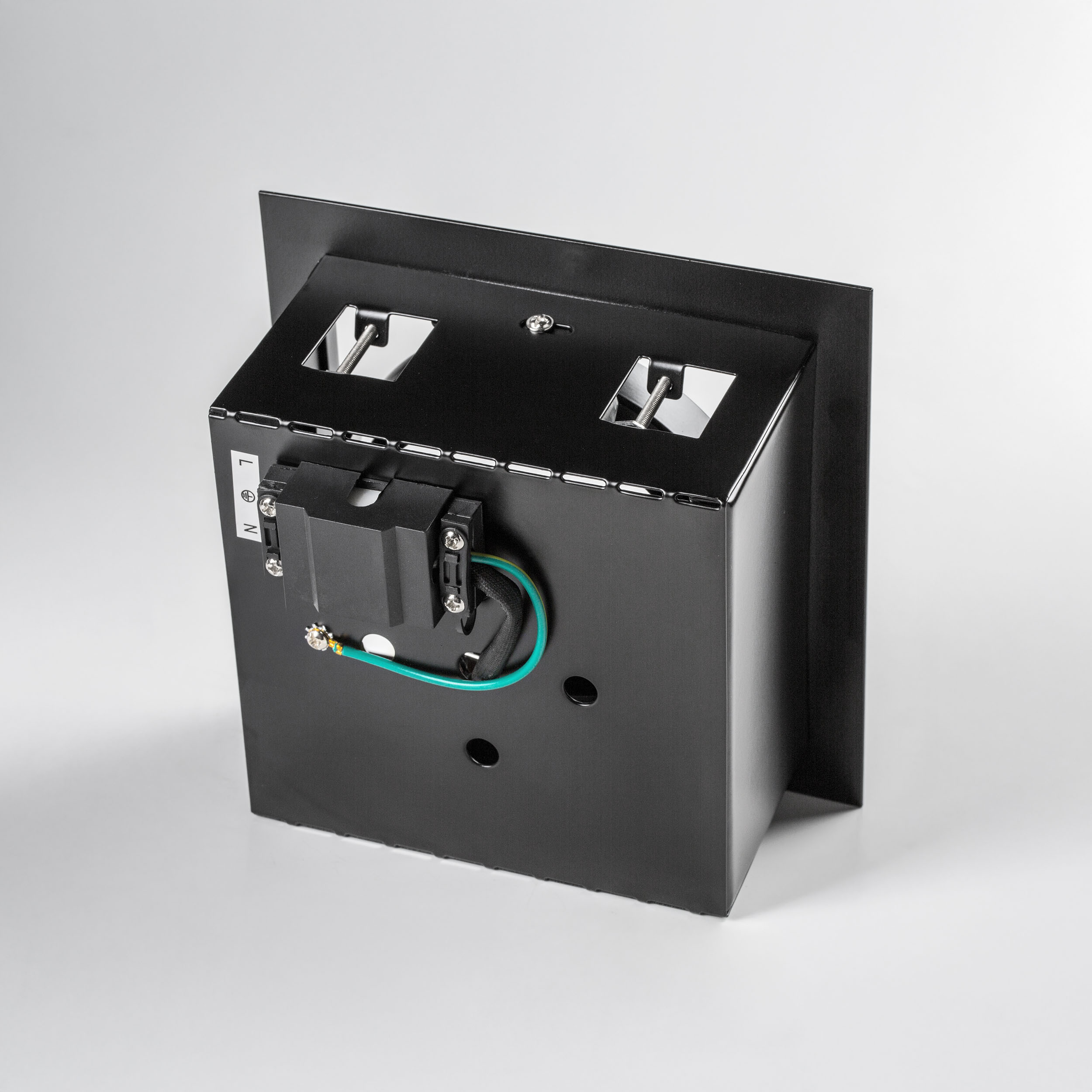 Врезное отверстие: 165x165 h100; Внешние габариты: 185x185 H5; Материал - основание/плафон: металл; Цвет-основание/плафон: черный; Лампа: 12 В DR111 max 50 Вт;